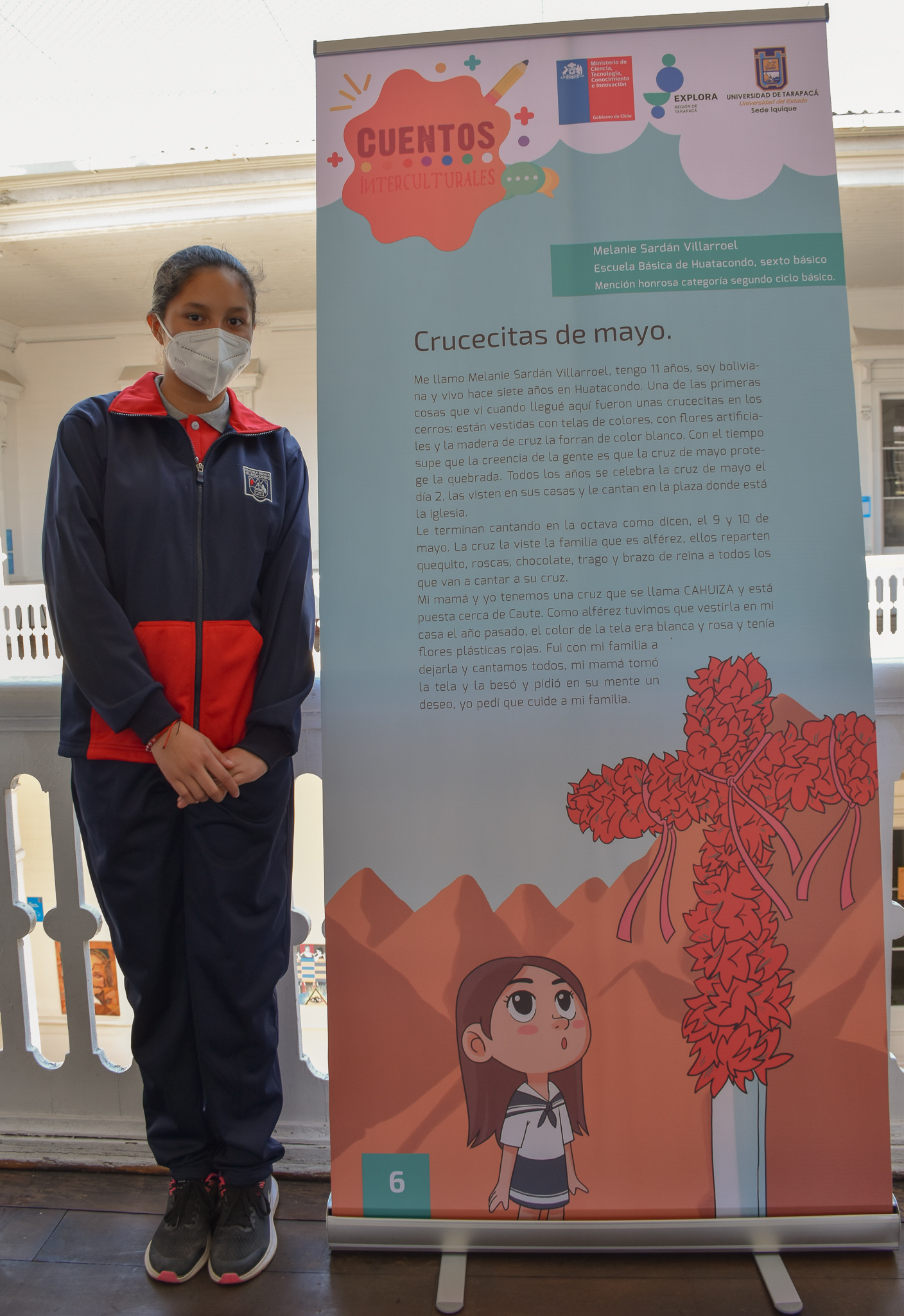 El segundo trabajo premiado fue el de Melanie Sardán (12) de séptimo básico, con la historia “Crucecitas de Mayo”, que grafica sus primeras impresiones tras llegar a Huatacondo a radicarse con su familia hace siete años, proveniente de Bolivia. “Una de las primeras cosas que vi cuando llegué, fueron las crucecitas en los cerros, vestidas con telas y flores. Con el tiempo, supe de la creencia de la gente, donde la cruz protege a la quebrada”, comentó.