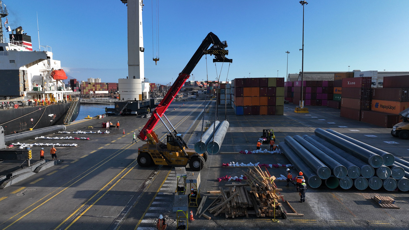 En ese contexto, una nueva transferencia de carga de 2 mil 205 tuberías se efectuó a través de Iquique Terminal Internacional (ITI), operación logística que se suma a la llegada de 2 mil 195 tuberías en abril pasado, completando así más de 4 mil tuberías de 15 metros de largo que por primera vez fueron desembarcadas y movilizadas dentro de la Región de Tarapacá.