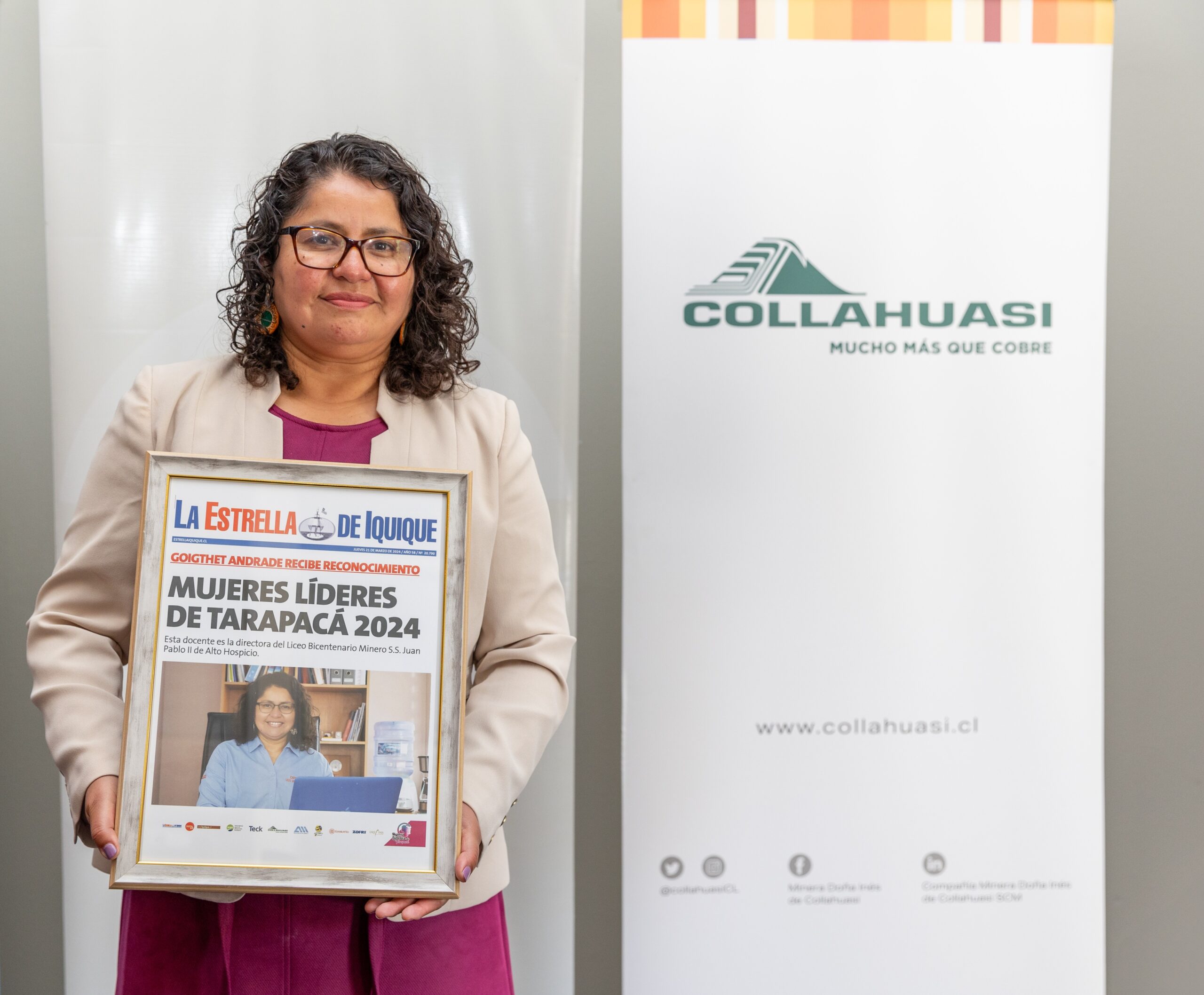 Entre las 10 galardonadas, estuvo la directora del Liceo Bicentenario Minero Juan Pablo II, Goighet Andrade, quien valoró ser reconocida por su labor en este establecimiento coadministrado por Fundación Collahuasi. “Esta campaña es una buena instancia para reconocer liderazgos femeninos. Agradezco profundamente mi postulación, ya que estamos trabajando por un proyecto educativo que impacta positivamente en la vida de muchas familias en Alto Hospicio. Espero que esta iniciativa inspire a que otras mujeres lideren y trabajen por sus sueños”, sostuvo.