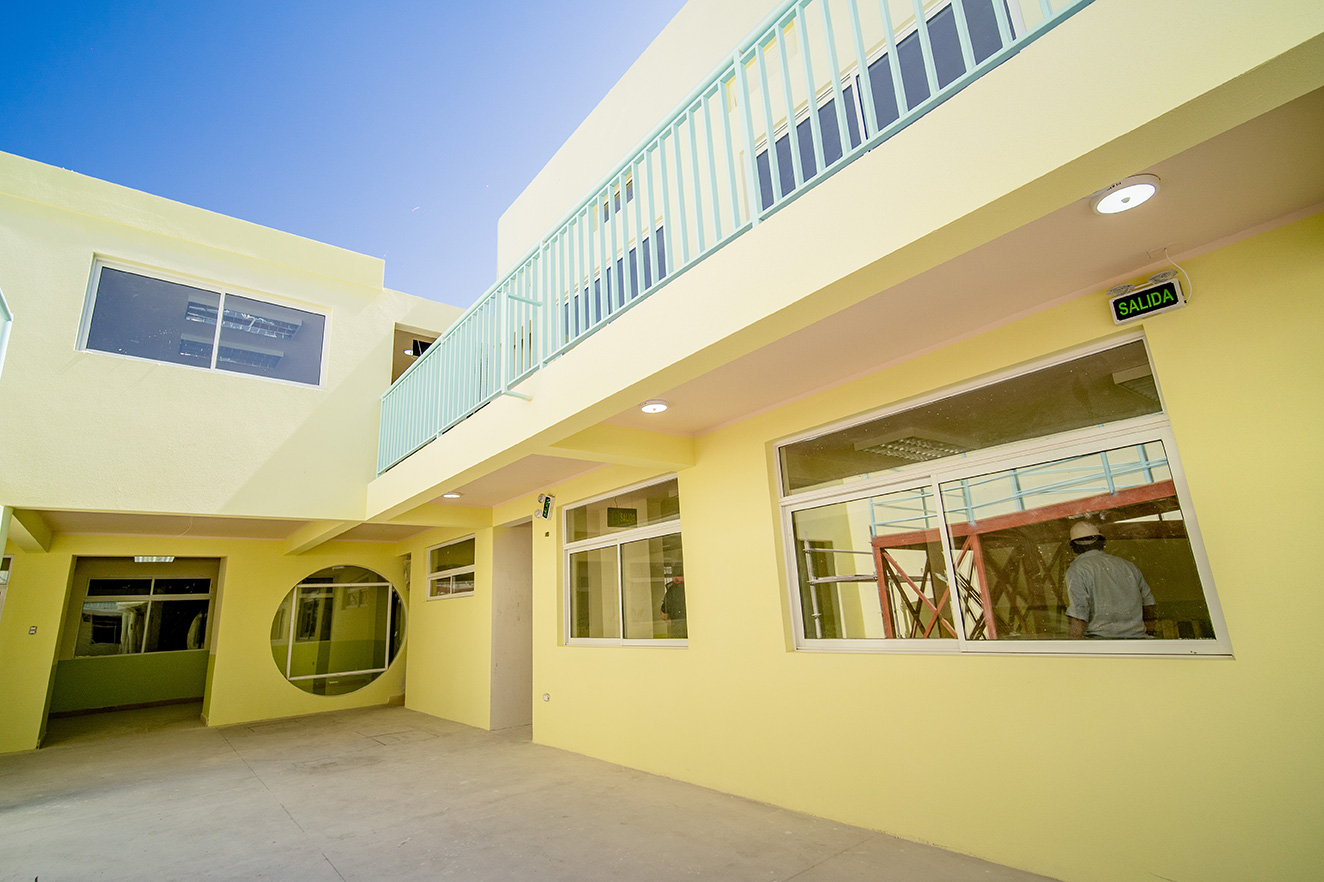 Los trabajos de construcción de la escuela se iniciaron en 2019 y comprende tres niveles emplazados en un terreno de 942 metros cuadrados construidos, con un ascensor, una rampa de acceso universal para personas con movilidad limitada; además de sistemas de energía solar para iluminación y eficiencia térmica, y tratamiento de reciclaje de aguas grises, entre otras innovaciones que ponen en valor la sustentabilidad y el cuidado medioambiental.