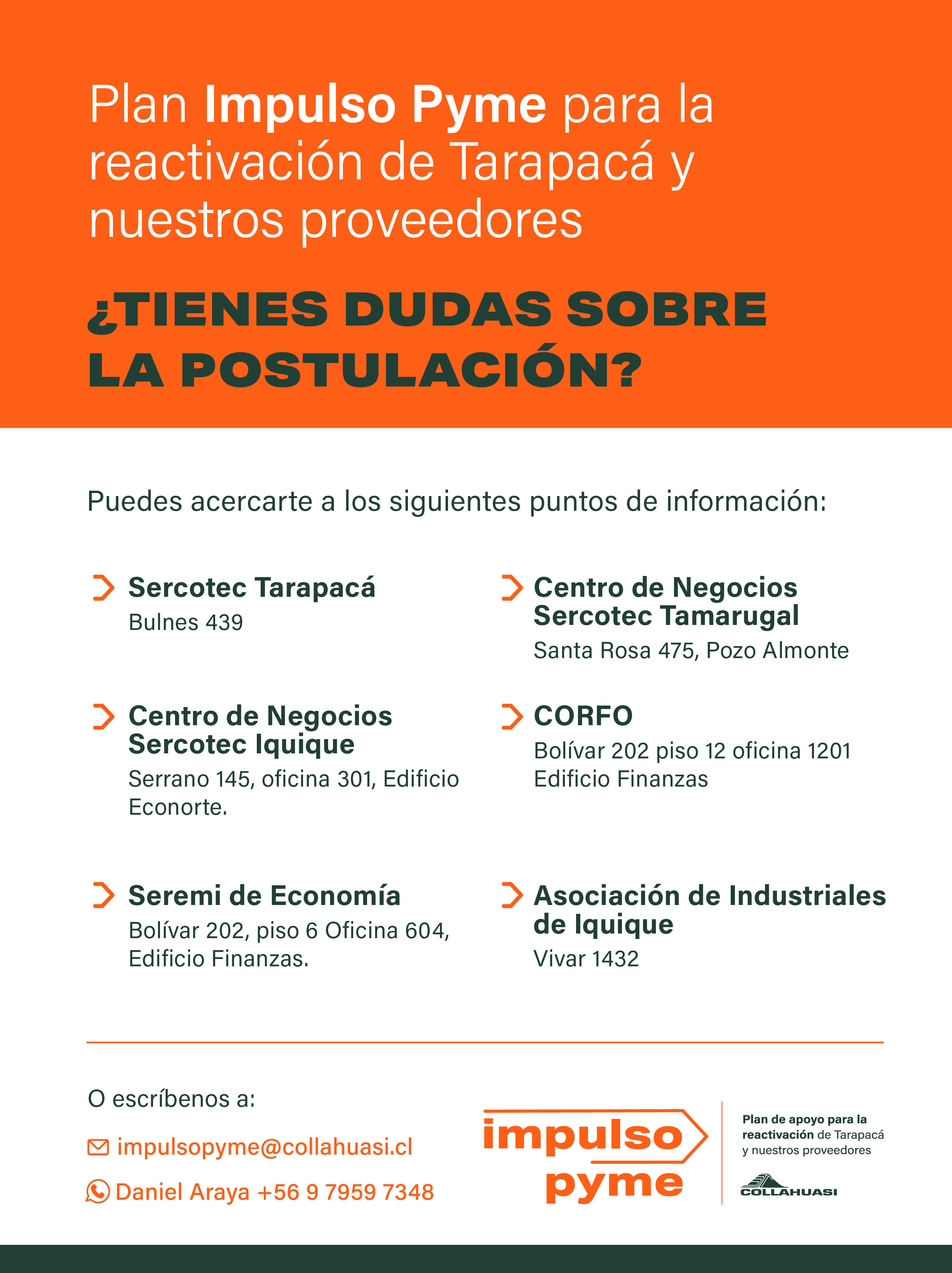 Si eres micro o pequeño empresario de Tarapacá y tu negocio tuvo daños en infraestructura o su actividad se ha visto afectada, ingresa a www.collahuasi.cl y completa la ficha de registro. Además, podrás descargar el instructivo de postulación y el documento de preguntas frecuentes. Si tienes dudas, está disponible el correo impulsopyme@collahuasi.cl y el teléfono +56979597348.