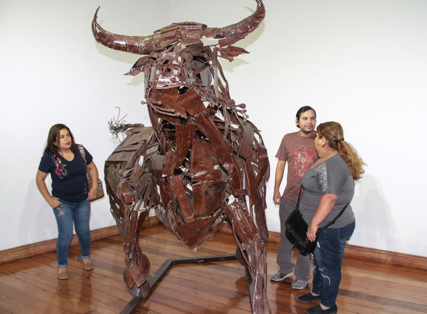 La primera parada es el Tesauro, el significado de su nombre en origen latín es “Tesoro” y fue inspirado en la transformación de escombros en arte. “De la escoria del mundo fue escogida para avergonzar a los sabios”, indica Soza. Tesauro tiene una medida de dos metros de alto, dos metros 40 de largo y un metro de ancho. El segundo es Defensor, obra metálica en base a fierros delgados de construcción con dimensiones de un metro y medio de alto, dos metros 80 centímetros de largo y un metro 10 de ancho. El tercero es Fragmentado, un toro constituido por siete partes. Aquí, Soza señala que el visitante puede echar a volar su imaginación y buscar al niño que cada uno lleva adentro, el mamífero metálico alcanza una longitud de un metro 75 centímetros de alto, dos metros 10 de largo y un metro de ancho.