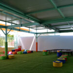 Las obras realizadas en el establecimiento consistieron en la modificación de la estructura existente como sombreadero y radier, e instalación de una cubierta de placa sandiwch de alta aislación térmica, como también una malla plástica que protegerá a los pequeños de los rayos UV. “Con todas estas modificaciones realizadas se logra un control climático del patio para los juegos de los párvulos”, dijo Arenas, quien recalcó que también se instaló pasto sintético en toda la superficie intervenida, mobiliario adecuado a escala de niños, juegos y módulos didácticos, pintura general, bodega de materiales y trabajos menores.