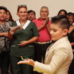 La ceremonia contempló una clínica en la que el artista enseñó no solo a confeccionar su diseño, sino también explicó el nombre del dinosaurio elegido y la actividad que realiza. Enseñó sus materiales y los implementos que usa para dar vida a sus trabajos.