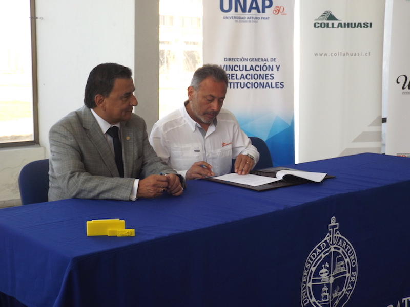 El jueves 13 de abril en el hall de extensión de la Facultad de Ingeniería y Arquitectura de la Universidad Arturo Prat, se firmó el convenio entre la casa de estudios superiores y Compañía Minera Doña Inés de Collahuasi, lo que marca el inicio de un trabajo colaborativo para desarrollar investigación ligada a la innovación y la sustentabilidad en la región de Tarapacá.